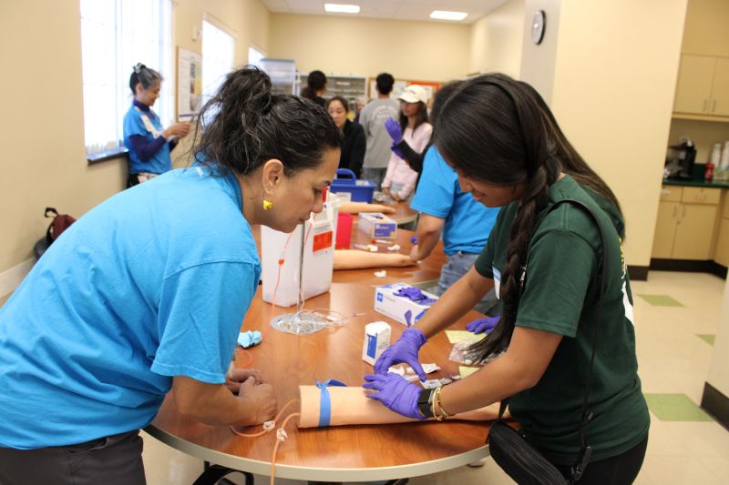 The five specialties featured during the event were primary care, physical therapy, pharmacy, wound care, and phlebotomy. Students practiced skills like taking vital signs using a stethoscope and blood pressure cuff and drawing blood from a realistic silicone arm. At the physical and occupational therapy station, participants learned about human anatomy and exercises for recovering from sports injuries in Kaiser Permanente’s on-site gym. Students enjoyed a Jeopardy-style game to test their pharmacy knowledge, and the wound care station emphasized the importance of proper wound treatment using fruits to illustrate what wounds look and feel like during the healing process.